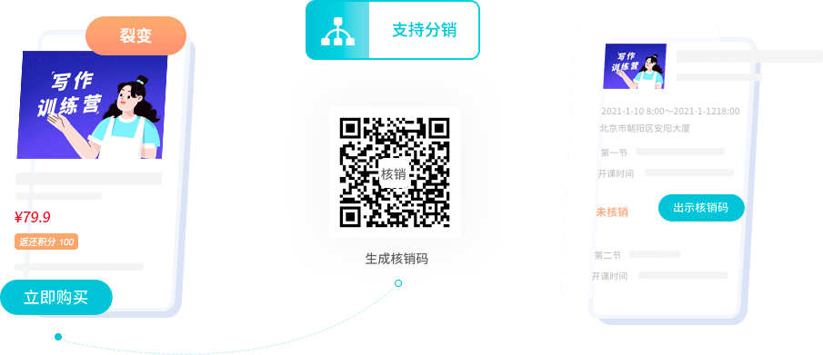 线上报名交费,生成核销码,线下核销课程,线上支持分销功能,促进成交裂变。