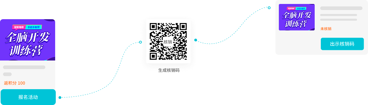 报名活动后,会自动生成核销码,现场出示核销码,由后台授权的核销人员现场核销。